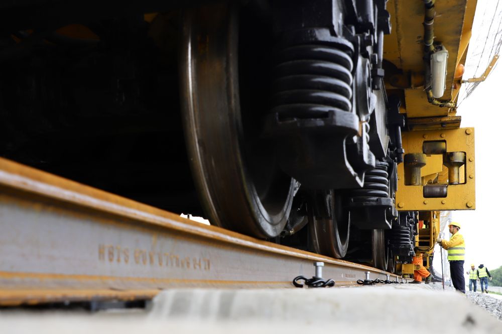 5月28日,哈伊高铁铺轨施工作业现场