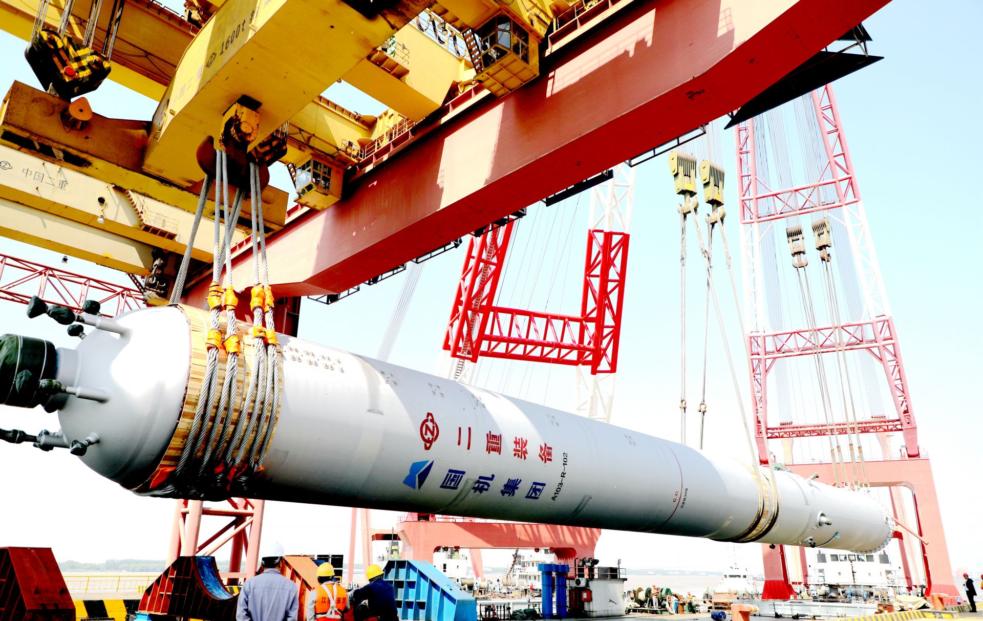 近日,国机重装成功研制的单件重达2300吨的两台超大超重加氢反应器在镇江基地重装码头装船发运