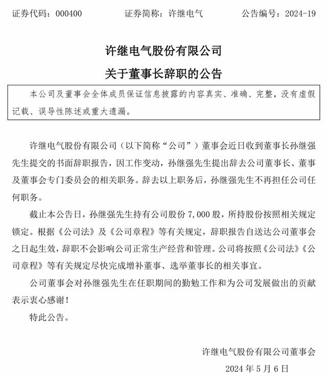 公开资料显示,孙继强出生于1969年,现年55周岁,他曾担任许继集团董事长和许继电气总经理等职务