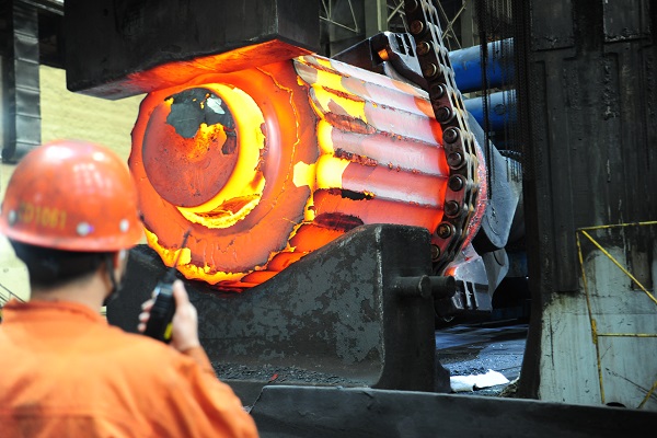 中信重工机械股份有限公司为重点客户制造的全球首套、“轧机之王”5600mm轧机关键件支承辊锻件、在河南洛阳总部18500吨油压机锻造完成