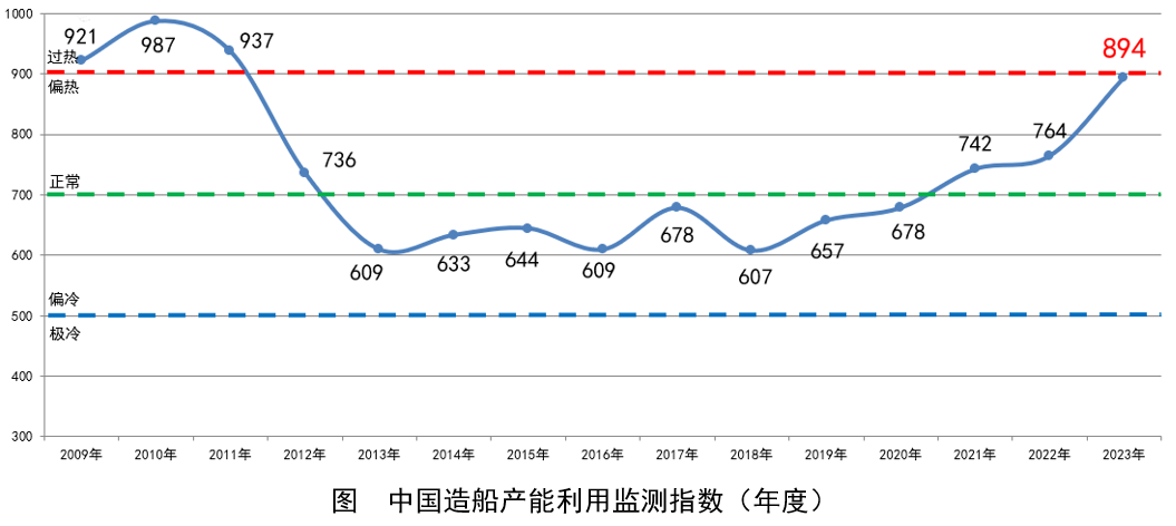 根据中国船舶工业协会最新数据显示,2023年中国造船产能利用监测指数(CCI)894点,与2022年相比提高130点,同比增长17.0%。从全年来看,CCI呈现逐季增长的态势。