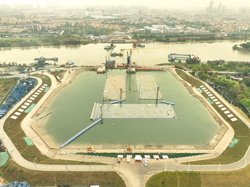沉管预制现场顺德伦桂路潭洲隧道工程是落实广东省“广佛全域同城化”与“粤港澳大湾区交通一体化”战略的标志性项目