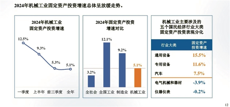 2024年,机械工业运行稳中有进,转型升级成效显著。国家统计局数据显示,机械工业经济运行一季度开局良好,二季度总体稳定,三季度主要指标增速放缓,四季度行业运行态势趋稳回升。