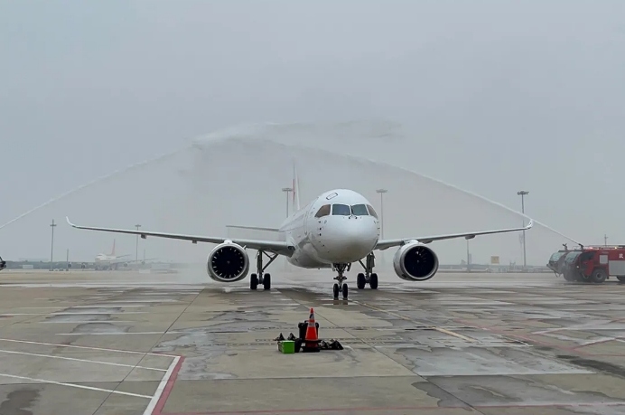 当天上午11时08分,飞机编号为B-657T的东航第九架C919执飞MU5385航班,从上海虹桥国际机场飞抵武汉天河国际机场,并受到民航最高礼仪“水门礼”的欢迎