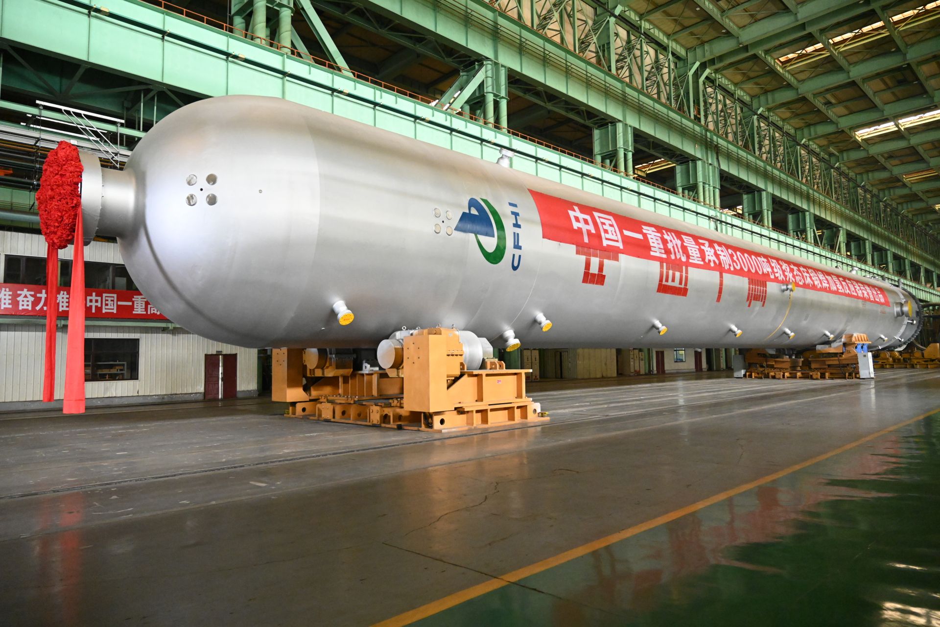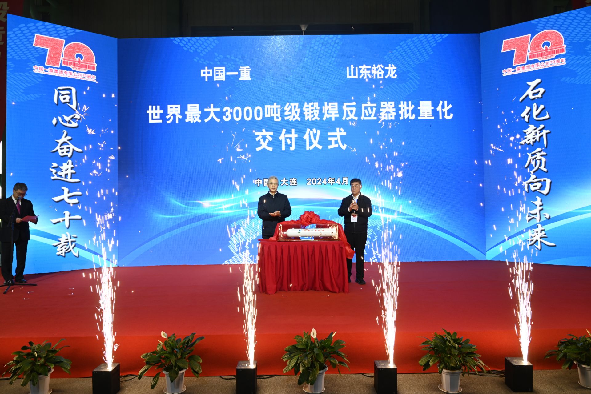 2024年4月29日,中国一重在大连核电石化基地组织召开以“同心奋进七十载,石化新质向未来”为主题的石化煤化工重大装备制造技术研讨会暨世界最大3000吨级锻焊反应器批量化交付仪式。中国一重承制的12台世界最大3000吨级浆态床锻焊加氢反应器最后3台全部完工交付,标志着我国重型石化技术装备制造能力稳步站上“3000吨”台阶,具备了同类装备批量化、专业化、流程化生产能力,成功刷新世界极限制造纪录,进一步彰显了中国一重作为“大国重器”的技术创新能力和超级工程创造实力。