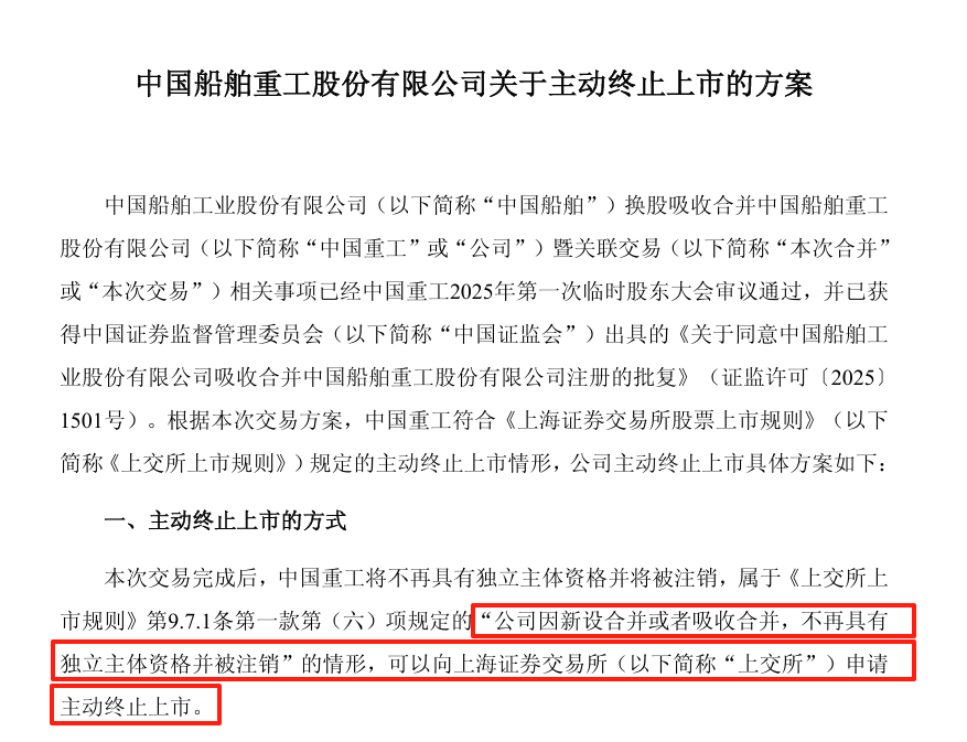 中国重工公告显示,中国船舶拟通过向中国重工全体换股股东发行A股股票的方式换股吸收合并中国重工相关事项已经公司于2月18日召开的2025年第一次临时股东大会审议通过,并已获得中国证券监督管理委员会出具的《关于同意中国船舶工业股份有限公司吸收合并中国船舶重工股份有限公司注册的批复》。此次交易将导致公司不再具有独立主体资格并被注销,可以向上海证券交易所申请主动终止上市。