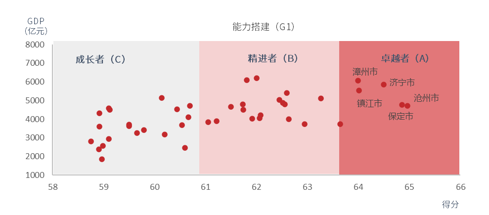 2025年《报告》将能力搭建(G1)和效能驱动(G2)阶段的城市进一步细分为卓越者(A)、精进者(B)和成长者(C)三个等级。能力搭建阶段的卓越者城市实现能力跃升,数字基础设施加快实现全域覆盖,治理和服务基本实现线上化、协同化。典型卓越者城市如沧州市、保定市、济宁市、镇江市、漳州市等。效能驱动阶段的卓越者城市已形成基础设施全域覆盖、治理服务“智能决策”“无感办理”、产业数字化深度渗透等先进模式和成效。典型卓越者城市如武汉市、天津市、青岛市、无锡市、济南市等。