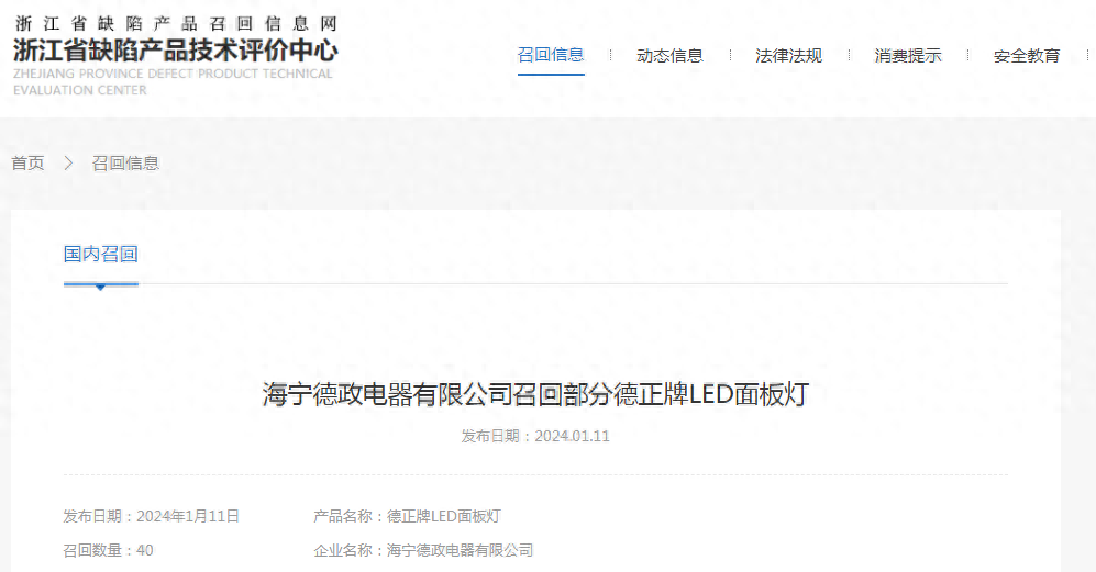 海宁德政电器有限公司召回部分德正牌LED面板灯