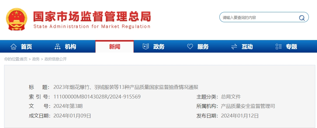 国家市场监督管理局对烟花爆竹产品进行抽查,61批次不合格