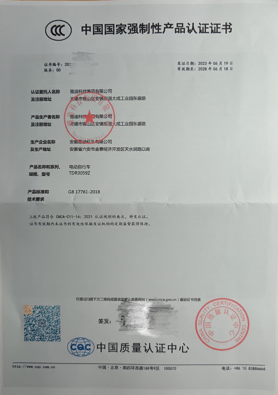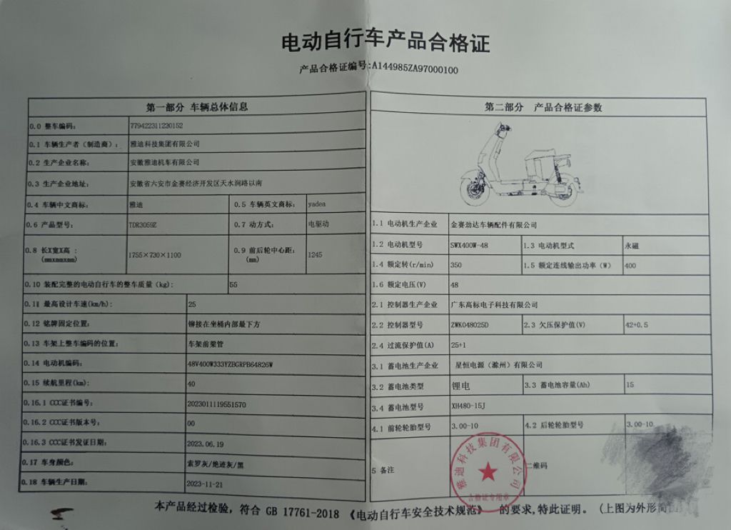 据上观新闻报道,上海某电动自行车品牌专卖店,对于改装车,店员甚至可以直接登陆“中国质量认证中心电动自行车产品查询合格证平台,并现场炮制电动自行车产品合格证——最高设计车速(km/h)、蓄电池类型、电池容量(Ah)等相关数据可以随便填写改动。打印出的合格证上不仅盖有该公司合格专用章,还有查询用的二维码。同时,在带有3C标志的“中国国家强制性产品认证证书”上,同样盖有“中国质量认证中心”印章以及二维码。