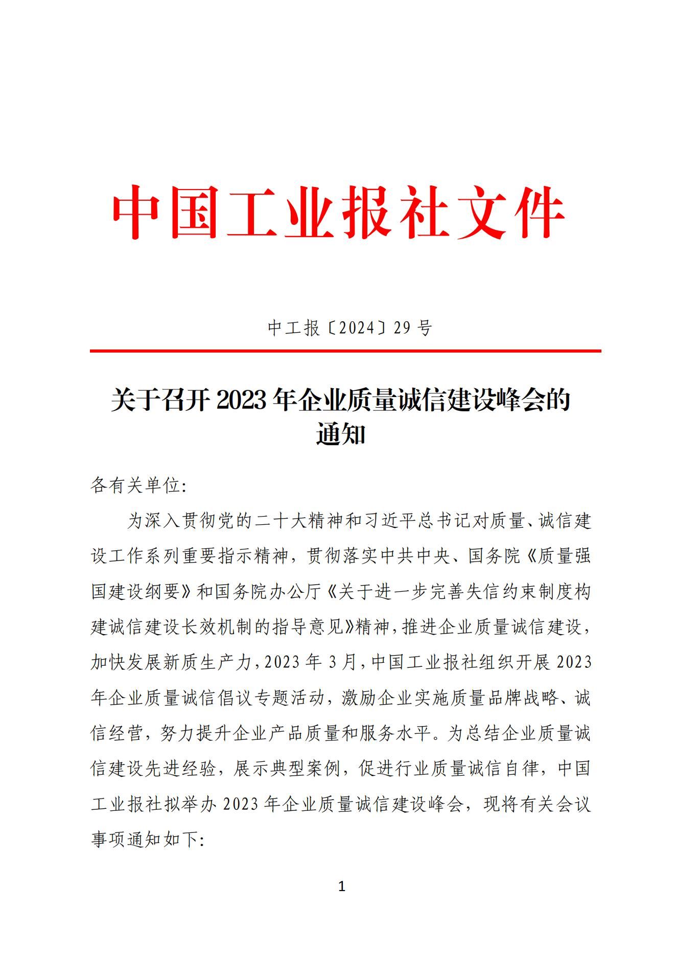 关于召开 2023 年企业质量诚信建设峰会的通知