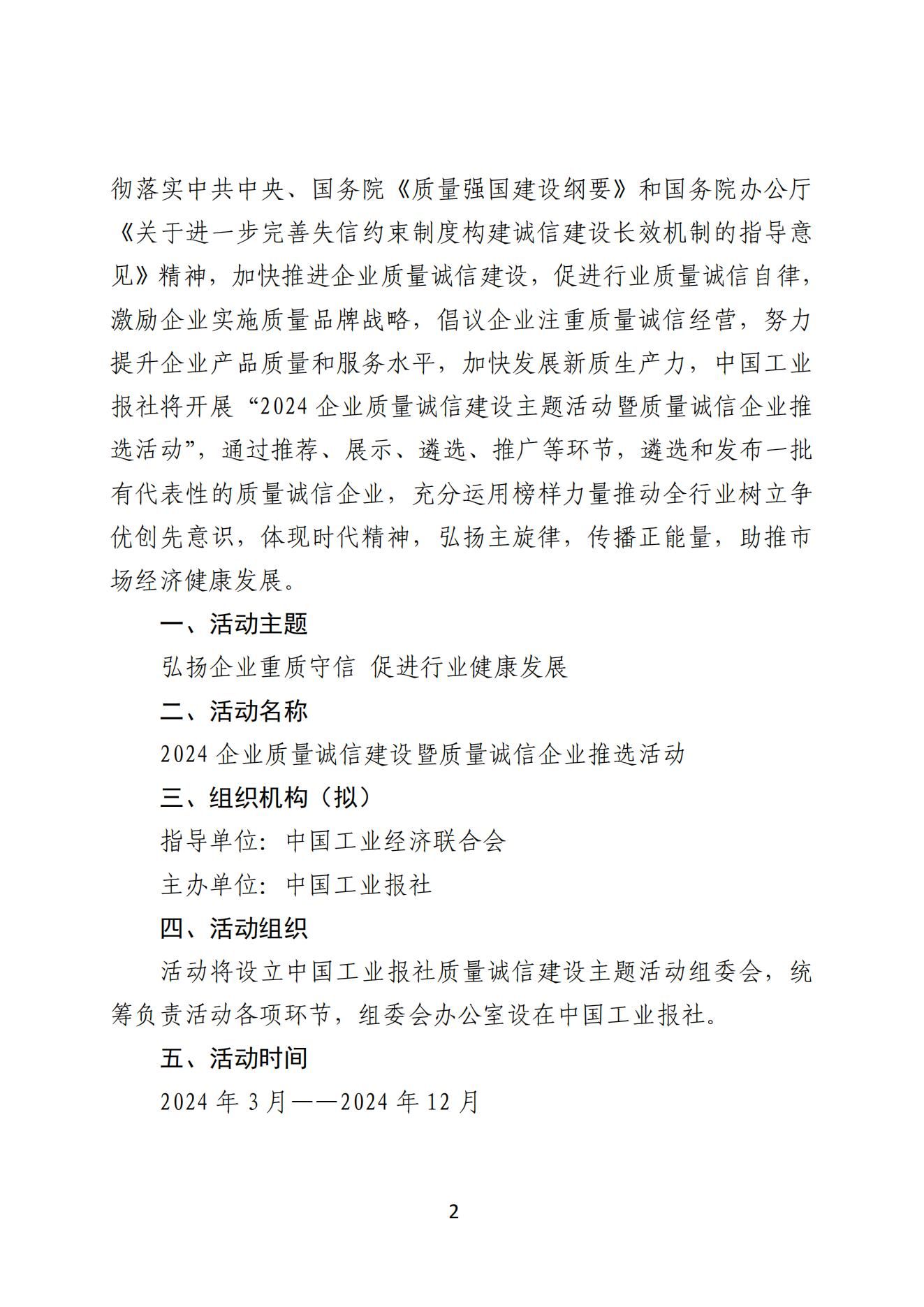 弘扬企业重质守信 促进行业健康发展 关于开展 2024 企业质量诚信建设暨质量诚信企业推选活动的通知