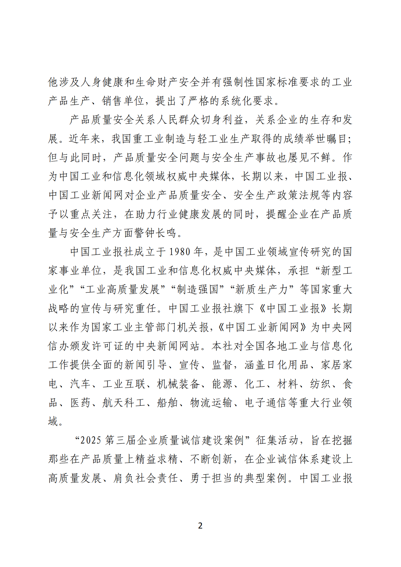 “2025第三届企业质量诚信建设案例”征集活动,旨在挖掘那些在产品质量上精益求精、不断创新,在企业诚信体系建设上高质量发展、肩负社会责任、勇于担当的典型案例。中国工业报社将携手全国各有关工业企业一道,守好安全底线,筑牢“质量长城”;保证人民安居乐业,守护国家安全;为中国工业经济高质量发展助力,为全面建设社会主义现代化国家添彩。