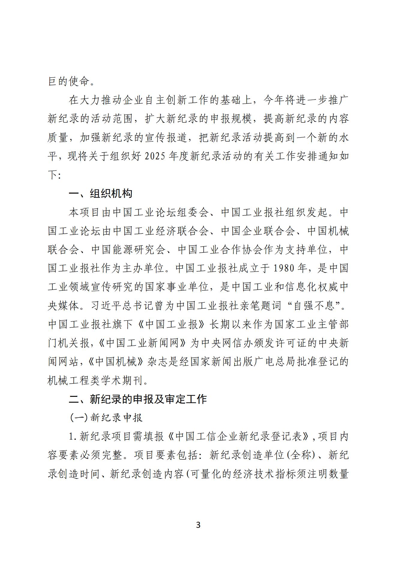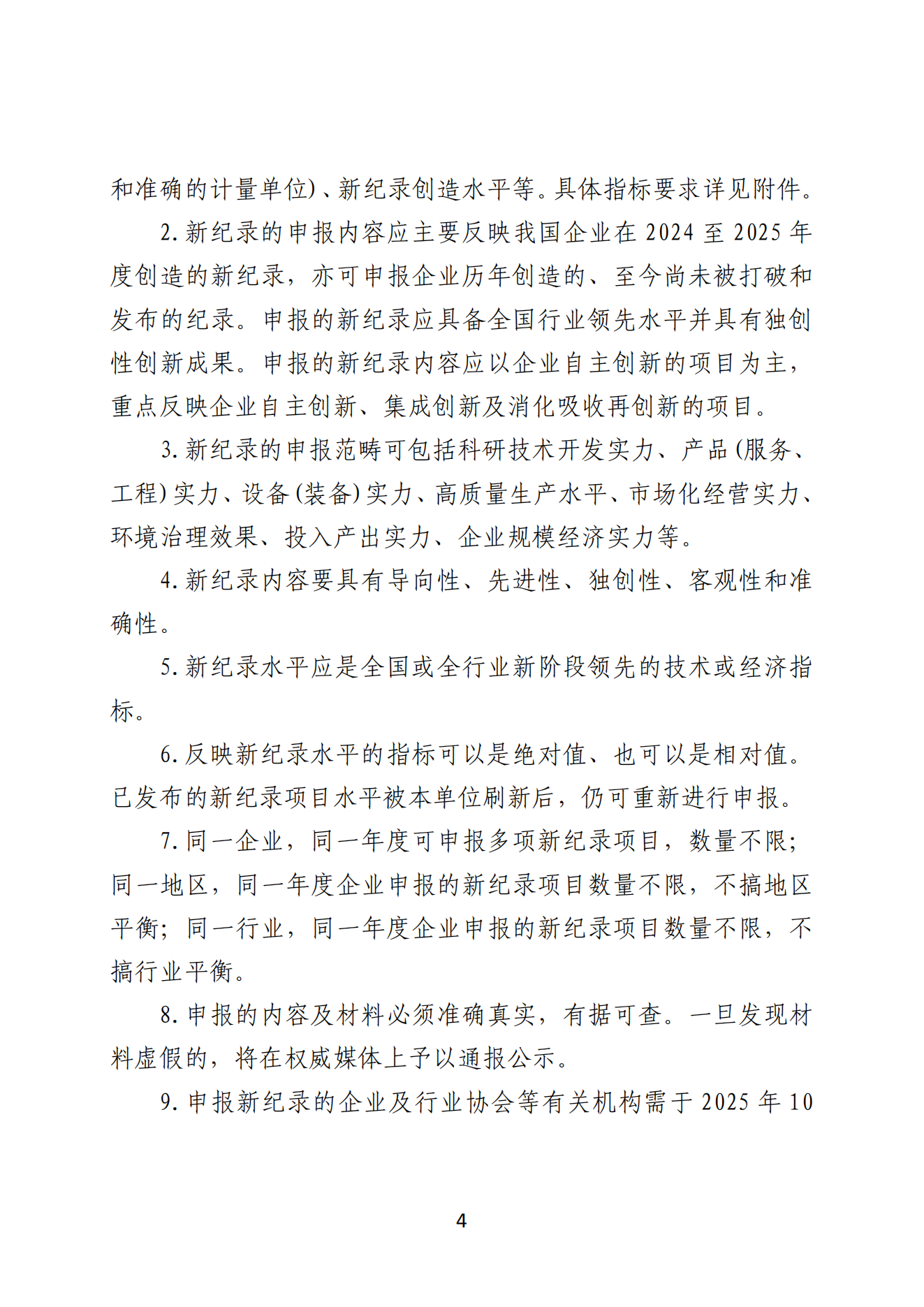 2.新纪录的申报内容应主要反映我国企业在2024至2025年度创造的新纪录,亦可申报企业历年创造的、至今尚未被打破和发布的纪录。申报的新纪录应具备全国行业领先水平并具有独创性创新成果。申报的新纪录内容应以企业自主创新的项目为主,重点反映企业自主创新、集成创新及消化吸收再创新的项目。