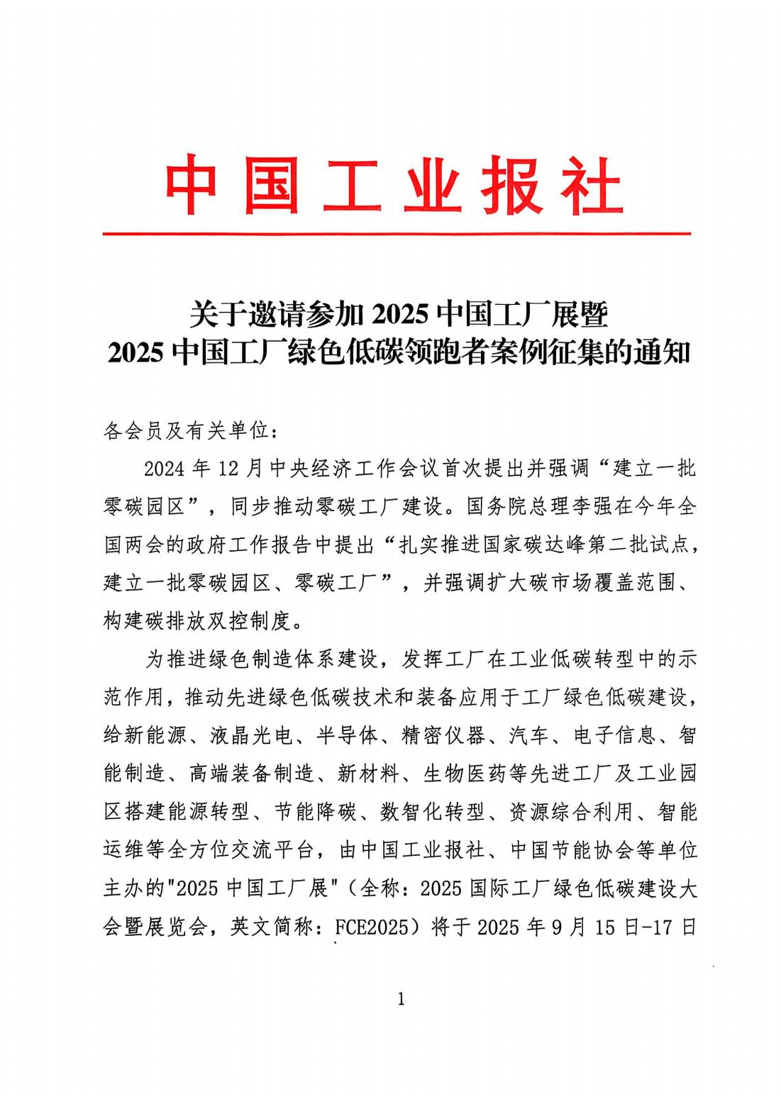 关于邀请参加2025中国工厂展暨2025中国工厂绿色低碳领跑者案例征集的通知
